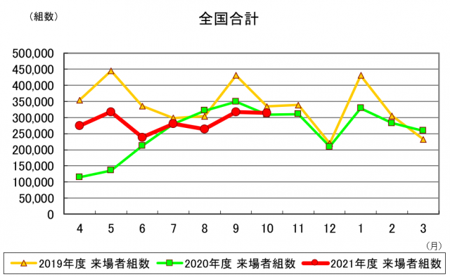 各エリアの来場者組数とその前年対比は以下の通り。カッコ( )内は対前年同月比の増減を表す。