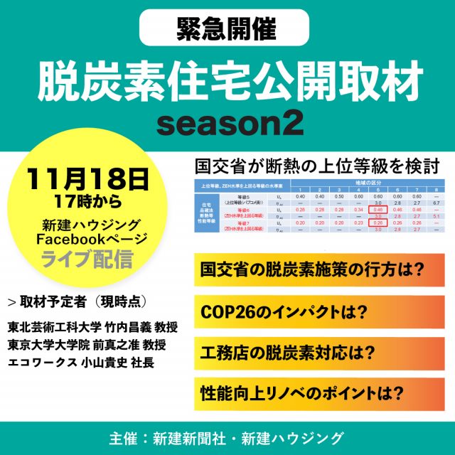 こうした最新の状況をキーマンに公開取材、整理・議論する【脱炭素住宅公開取材 season2】を11月18日(木)17時からFacebookライブにて生配信!