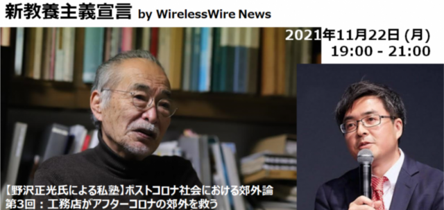 建築家・野沢正光氏による私塾「ポストコロナにおける新しい郊外論」(全7回)の第3回「工務店がアフターコロナの郊外を救う」が11月22日、オンライン(Zoom)にて開催される。ゲストに新建新聞社代表取締役社長の三浦祐成を迎え、住宅建設業界をとりまく現状を再確認するだけでなく、アフターコロナの郊外において工務店の担う役割について考える。