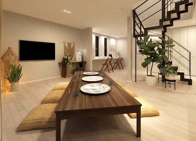 3LDKの間取りの中心には大きな螺旋階段を設置し、アマハジから入った南風が1階から2階へと抜けるように設計。1階は壁を設けないワンルームとし、家中で同じ空気を共にする一体感と、どこにいても気持ちの良い風を感じられる仕様とした。1階ワンルームの一角には、家庭内ワークスペースも設置し、南風と家族の存在を感じながら快適に仕事に集中できる。視覚的・体感的に緩やかにつながっていくボーダレスと、風や人、時の流れが外から中心に集まってくるような生活動線で、沖縄の風と光の心地良さを存分に感じられるという。