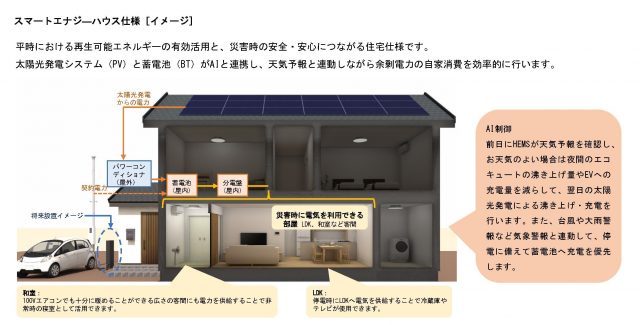 また、発電した電気をできるだけ自家消費するため、AIと連携し、天気予報と連動しながら日中に給湯器の湯沸かしを行うこともできる。停電時にはLDKへ電気を供給することで、冷蔵庫やテレビが使用可能。EV充電が可能な予備配管も設置する。