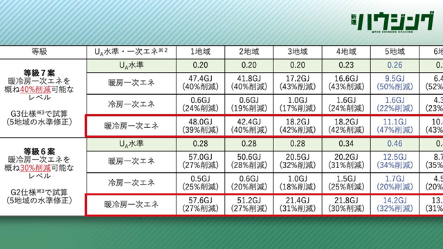 国交省の試算によると、HEAT20・G2、G3のUA値の水準でほぼエネルギー削減率の目安を達成できるとして、G2、G3が指標として採用されることとなった。