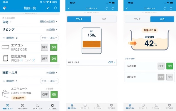 スマートフォンアプリ「Daikin Smart APP」を利用することで、外出先や家の中の離れた場所から湯はりや追いだきができるほか、給湯使用量・設定温度の確認、湯はりの進捗確認などが可能。2022年3月のアップデートでは、湯はりの時間予約、太陽光発電の余剰電力で昼間の沸き上げを行う「昼間シフト」、湯はりと同時に脱衣室のエアコンを自動でオンにするエアコン連動機能にも対応する。さらに、遠隔からお湯の使用状況や蛇口の閉め忘れを確認できるため、離れて暮らす家族の見守りに利用することもできる。