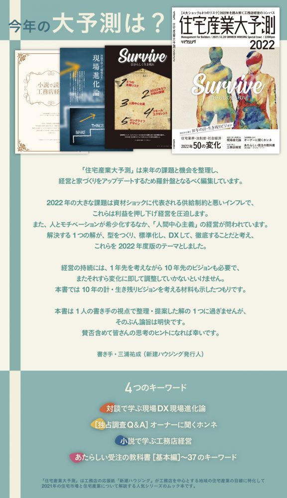 | contents | 【巻頭言】 Survive 〜自分らしく生き残れ〜 ・2022年50の変化をよむ 住宅業界の変化/法制度の変化/社会・経済の変化 ・対話で学ぶ現場DX 現場進化論 ・独自調査Q&A オーナーに聞くホンネ ・あたらしい受注の教科書 37のキーワード ・小説で学ぶ工務店経営 |