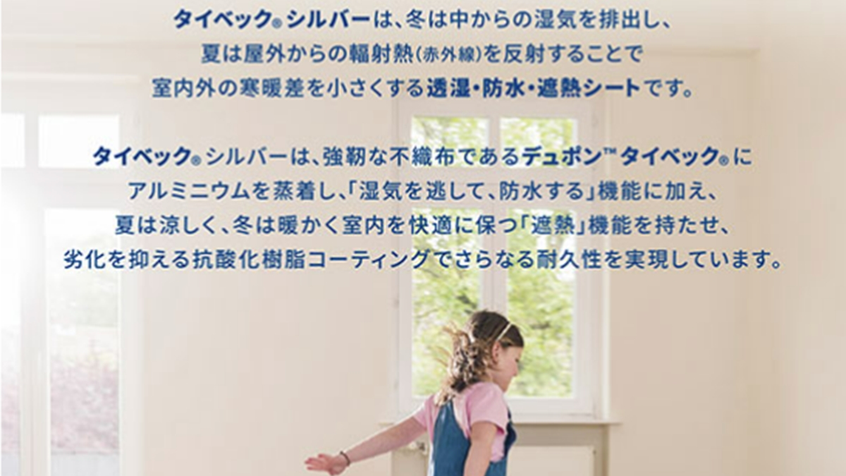 シルバーは、高密度ポリエチレン不織布タイベックにアルミニウムを蒸着させ、繊維の一本ずつにアルミニウムの劣化を防ぐ「抗酸化樹脂コーティング」を施した遮熱シート。ハウスラップと比較してシルバーは、遮熱性に優れているのが特徴。同社内に設置している研究所の測定結果によると、赤外線反射率約85%と高い遮熱性がある。