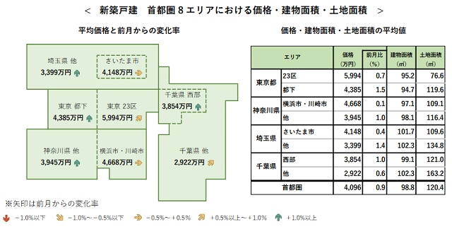 首都圏全体の平均価格は4096万円で、前月比0.9%上昇。8エリア中7エリアで前年同月超えとなり、東京都(23区/都下)、神奈川県(横浜市・川崎市/他)、埼玉県(さいたま市/他)、千葉県西部は2017年1月以降最高額を更新した。