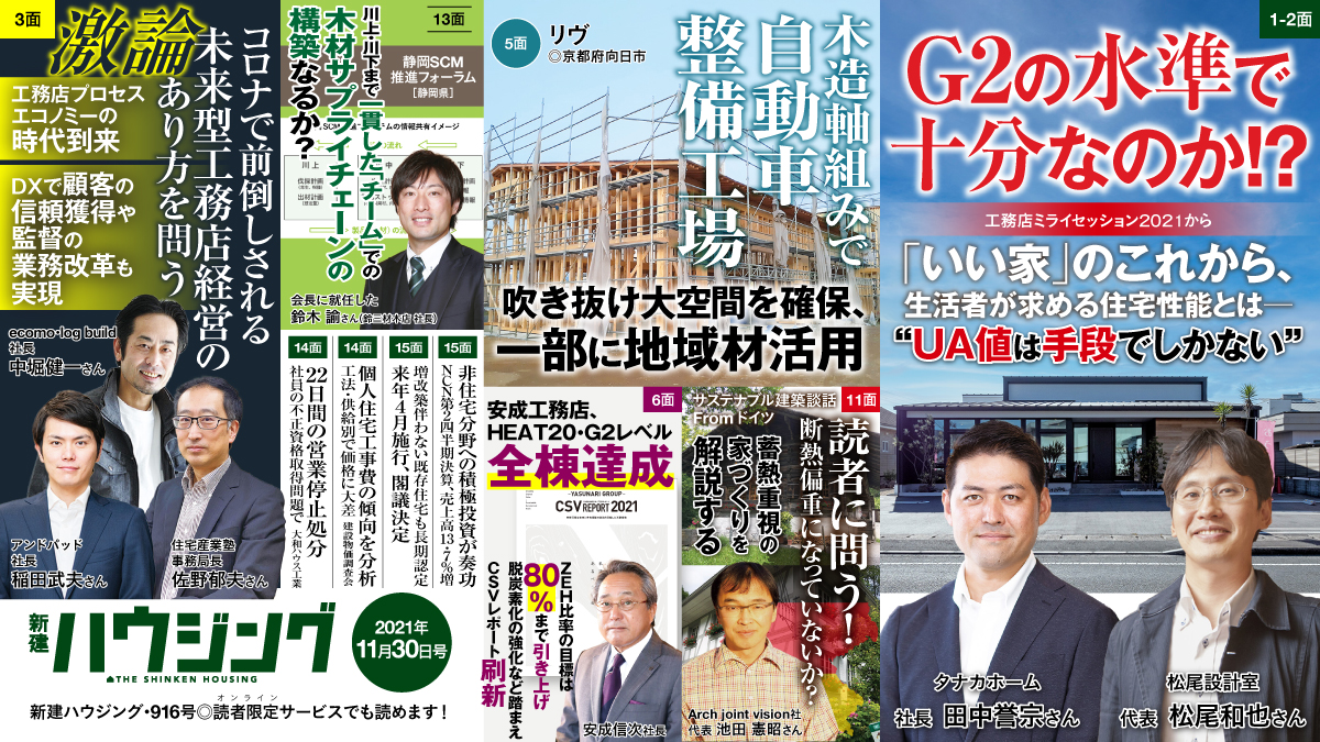 11月30日号のトップ記事は、本紙が11月17日~19日にかけて開催した「工務店ミライセッション2021」をレポートしました。3日間にわたってリアル・オンライン含め、約1600人が参加。コロナ禍の暮らし、脱炭素化を目指す社会で、人々の価値観が変化する中、登壇した24人のスピーカーから家づくりや工務店経営の「これから(=未来)」のあり方について有効なヒントが示されました。