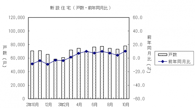 国土交通省が11月30日発表した10月の新設住宅着工戸数は、持家・貸家・分譲住宅の全分野で増加し、前年同月比10.4%増の7万8004戸となり、8カ月連続の増加となった。季節調整済年率換算値は、前月比5.6%増の89.2万戸。
