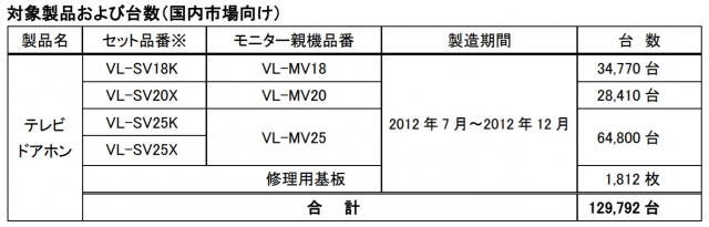今年8月に3件の発煙事故があり、調査の結果、製品内部の基板上でパターンやコイル部品が焼損していたことから、この部分で短絡が発生し、発煙に至ったと原因を推定。昨年8月にも1件の発煙事例があり、その時は原因を特定できなかったが、その後の調査でいずれもコイル部品に赤リンの含有が認められた。コイル部品メーカーと調査を進め、納入仕様書に記載のない赤リンを含有した樹脂が、一時期コイル部品の材料として使用されていた事実を確認した。これにより、室内側モニター親機内部の基板に一時期使用された赤リンを含有したコイル部品が発煙事故の原因と判断し、この時期に製造された4品番をリコール対象(下表、同社ホームページより)とした。