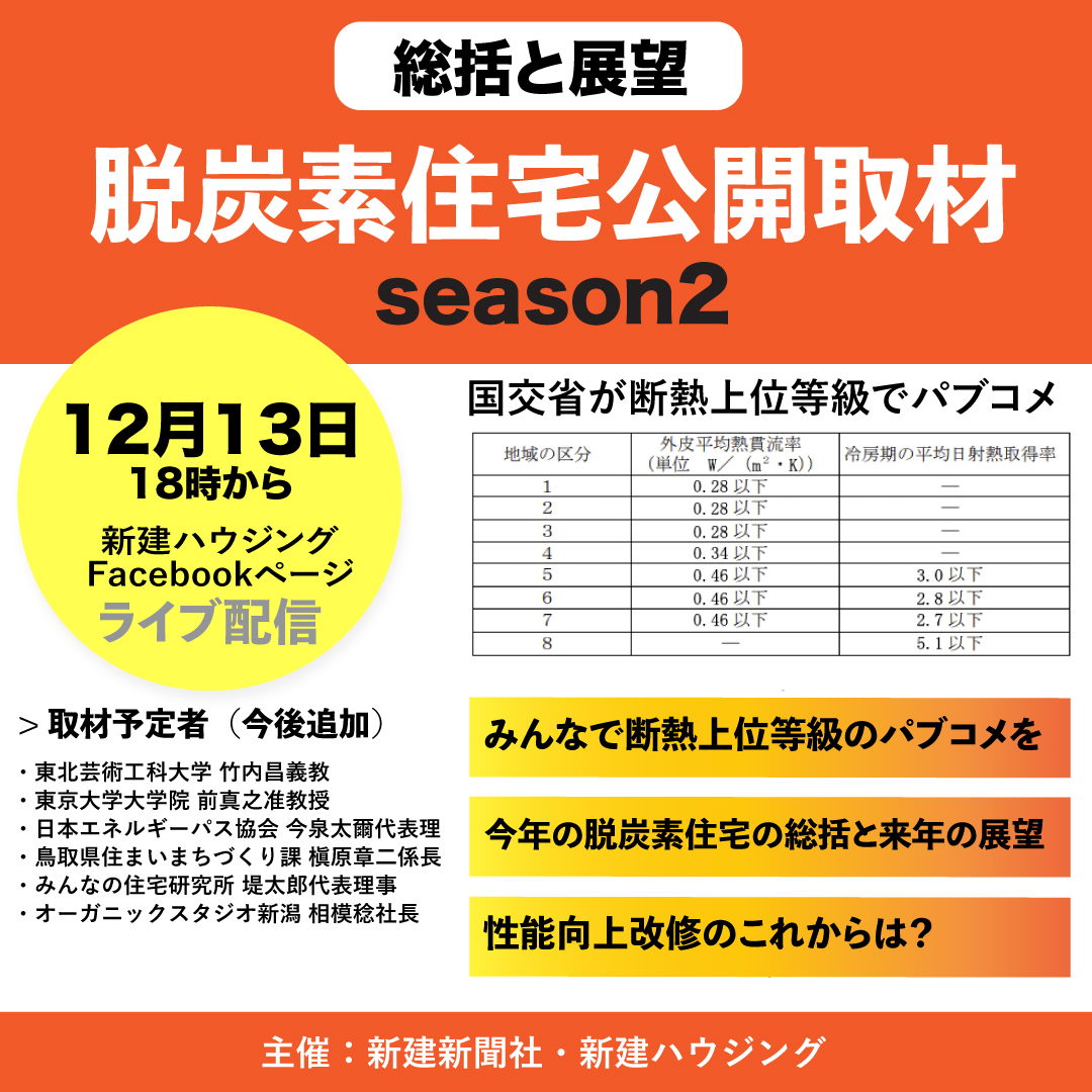 新建ハウジングでは12月13日18時から、脱炭素住宅公開取材 season2の第2回を開催する。