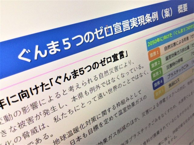 宣言は、①自然災害による死者ゼロ②温室効果ガス排出量ゼロ③災害時の停電ゼロ④プラスチックごみゼロ⑤食品ロスゼロ――で構成。群馬県は、宣言を条例に位置付けることで、同県の環境面の長期的な方向性を示すとともに、施策の継続性・予見可能性を高めて、取り組みを加速させるとしている。