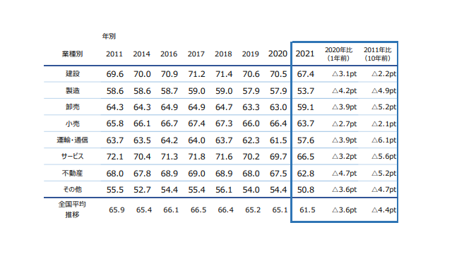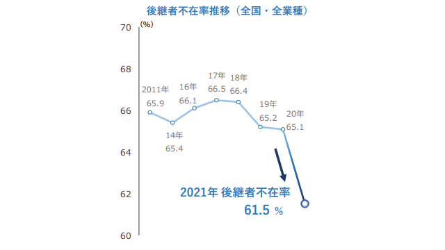 その結果、2021年の全国・全業種約26万6000社において、後継者が「いない」、または「未定」とした企業は16万社に上った。後継者不在率は61.5%。2020年の不在率65.1%から3.6ポイントの改善、4年連続で不在率が低下し、調査を開始した2011年以降で最低となった。