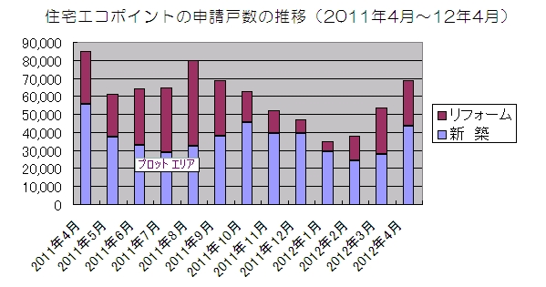 国土交通省などが5月18日に発表した4月単月の住宅エコポイントの申請戸数は、新築が4万3392戸、リフォームが2万5231戸で合計6万8623戸だった。新築の申請戸数が4万戸を超えたのは、2011年10月以来。