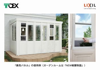 「換気パネル」は、同社ガーデンルーム「NEW 暖蘭物語」の折戸パネルのひとつで、窓が上下にスライド開閉し、窓と連動する網戸により風だけを通し虫の進入を防ぐ。