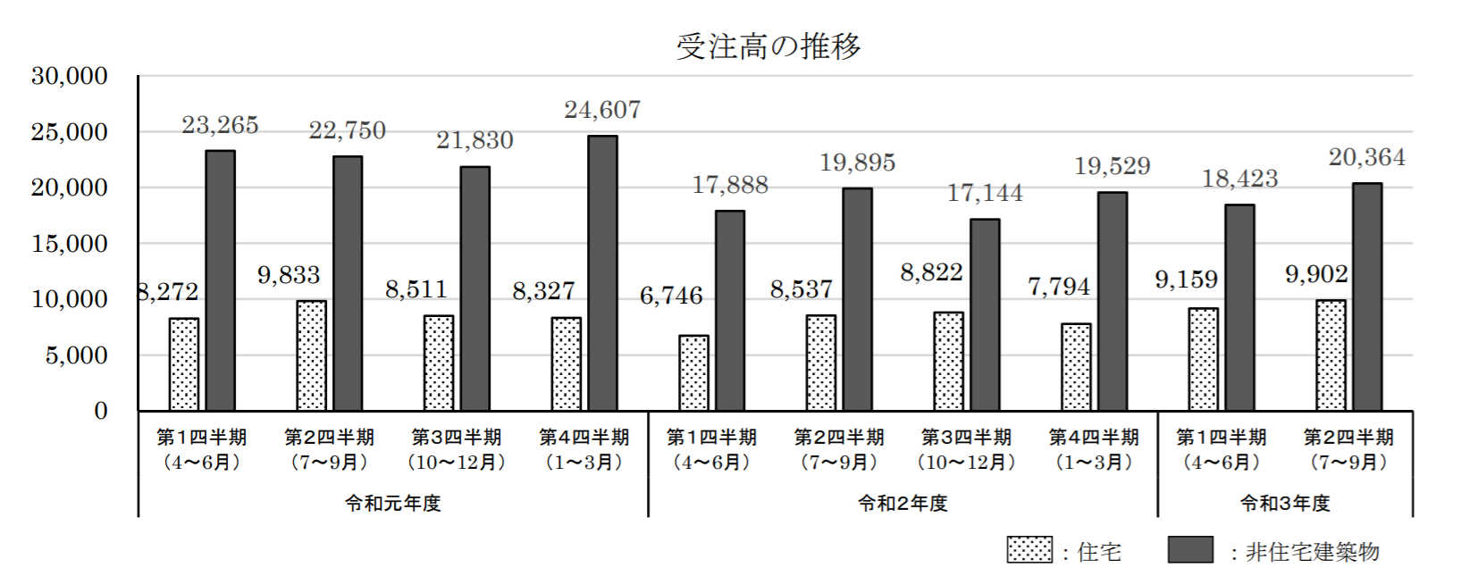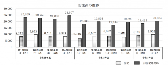 国土交通省は12月10日、「建築物リフォーム・リニューアル調査報告」の2021年度第2四半期受注分を発表した。リフォーム・リニューアルの受注高は前年同期比6.5%増の3兆266億円。このうち住宅は16.0%増の9902億円、非住宅は2.4%増の2兆364億円となった。