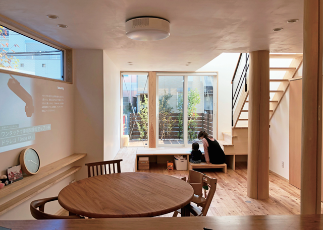 榊住建の最新作「N邸」1階LDK。大黒柱は施主と共に飯能で伐採したスギ。一段高くなったデッキ状のスペースは、外からの視線を遮り、階段の納まりを良くするためだが、子どもにとってはちょうどいいテーブルだ