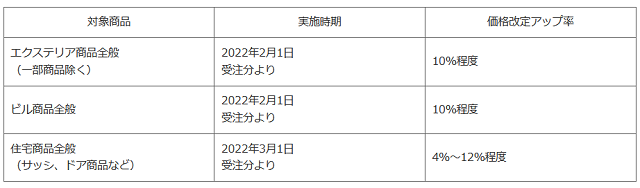エクステリア商品全般(一部商品除く)・ビル商品全般は2月1日受注分から10%程度、住宅商品全般は3月1日受注分から4%~12%程度の価格改定を予定している。