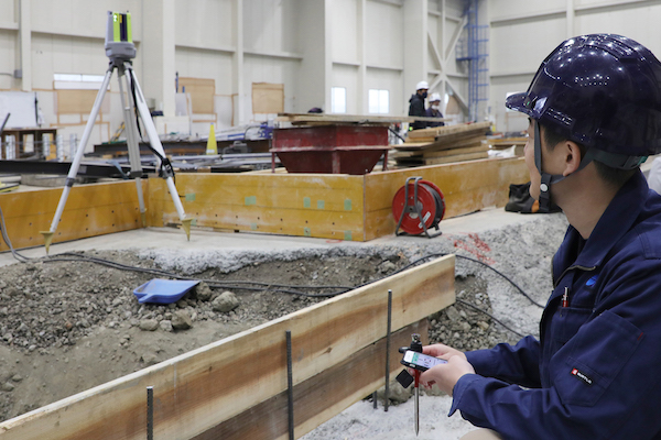 「楽位置」は、従来コンベックスや回転レーザー、セオドライトで行っていた距離・高さ・角度などの計測を1台で行い、客観的な位置情報をデジタルで保存。本体を置いて電源ボタンを押すだけで自動的に整準し、作業者が持つ小型プリズムを追尾して位置計測するため、本体側に作業者がつく必要がない。操作はスマホで行う。「楽墨」と連携して設計点まで寸法と方向で誘導してくれるため、確認・検査に使うこともできる。高低差のある現場にも対応する。