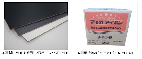 アイカ工業(名古屋市)は12月、輸入合板の供給減および高騰を受けて、合板の替わりにMDFを基材に使用した化粧ボード「カラーフィットポリMDF」と、その施工に適した専用接着剤「アイカアイボンA-MDF40」を発売した。
