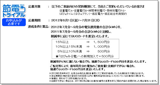 同制度は、2012年7月分~9月分の電気使用量を、2011年7月分~9月分と比較し、その削減率に応じてQUOカードを進呈するもの。削減率が15%以上で1500円分、10%以上で1000円分、5%以上で500円分のQUOカードを贈呈する。節電率が5%未満でも、抽選で1000世帯に500円分をプレゼントする。