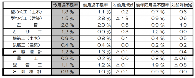 職種別の状況では、すべての職種で不足。特に左官2.8%の不足率が大きい。また、配管工の過不足率について対前年の減少幅が大きくなっている(1.9%→1.1%)。