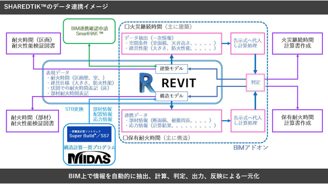 火災継続時間の算定に必要な材料などの建築情報と、保有耐火時間の算定に必要な構造情報は、同一モデルからデータを抽出し、自動計算により火災継続時間と保有耐火時間の比較が機能的に処理できる。NG判定が出た場合は、システム上に不備な箇所が明示されるため、BIMのデータの修正や更新、再計算することで容易に是正が可能。同時にBIMへ是正部分のフィードバックも行える。
