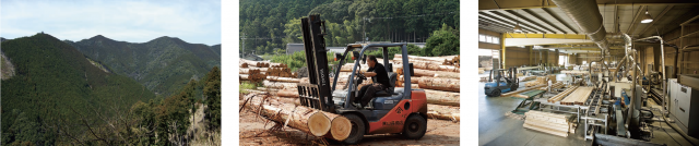 ◉山長商店のグループでは山を循環させる持続可能な林業を実践するために、紀州の山から丸太を伐り出し、製材からプレカットまで一気通貫のサプライチェーンを展開している