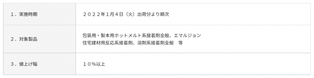 接着剤の主原料である石油系の原材料価格が大幅に上昇しており、コスト削減のためのあらゆる方策を行ってきたが「自助努力も限界に達した」。また、資材調達難により製品供給にも懸念が生じているとし、安定供給を維持するため価格改定に踏み切った。