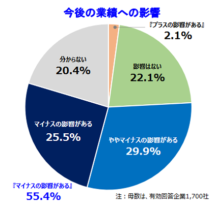 帝国データバンク(東京都港区)はこのほど、新型コロナウイルスの新たな変異株「オミクロン株」に対する企業の見解について調査した結果を発表した。有効回答企業数は1700社。オミクロン株による今後の業績への影響は、55.4%の企業が「ややマイナス・マイナスの影響がある」と回答。半数超の企業が今後の業績をマイナスと見込んでいることがわかった。「プラスの影響がある」は2.1%、「影響はない」は22.1%で、約4社に1社は悪影響はないと回答。約5社に1社は「分からない」とした。