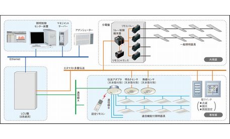 新システムは、通信機能付き照明器具を接続することで、照明器具1台ごとの簡易的な電力使用量を「見える化」。照明器具1台ごとに直接点消灯信号が送信されるため、施工時やレイアウト変更の際の電源配線・調光配線の区分けが不要。
