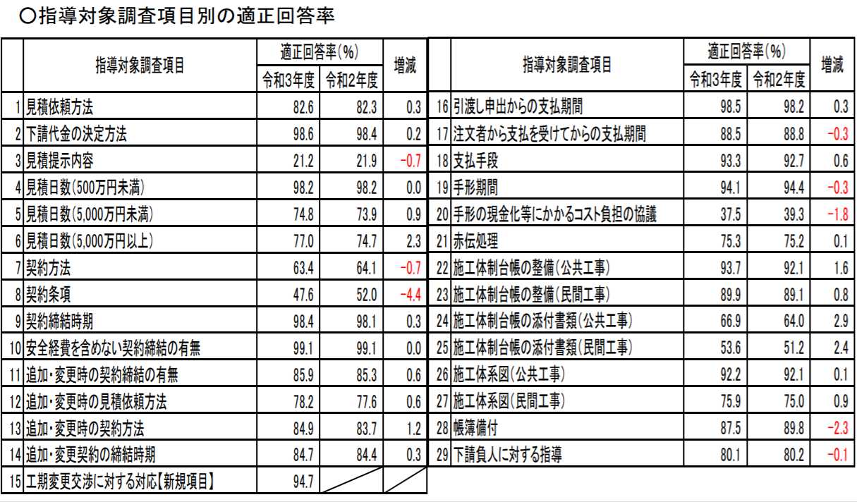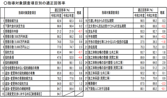 調査対象は1万8000業者で、2020年10月1日~2021年6月30日の取引について、郵送による書面調査を実施した。回収率79.7%(1万4338業者)。調査内容は、元請負人と下請負人の間や発注者(施主)と元請負人の間の取引の実態等、▽見積方法(法定福利費、労務費、工期)の状況、▽約束手形の期間短縮や電子化の状況、▽技能労働者への賃金支払状況――等。