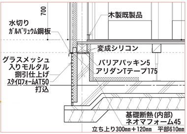 ➡外側の断熱材を50mm厚としたのは既製品の水切りが使える厚みであるため。水切りを製作するとコストが嵩む