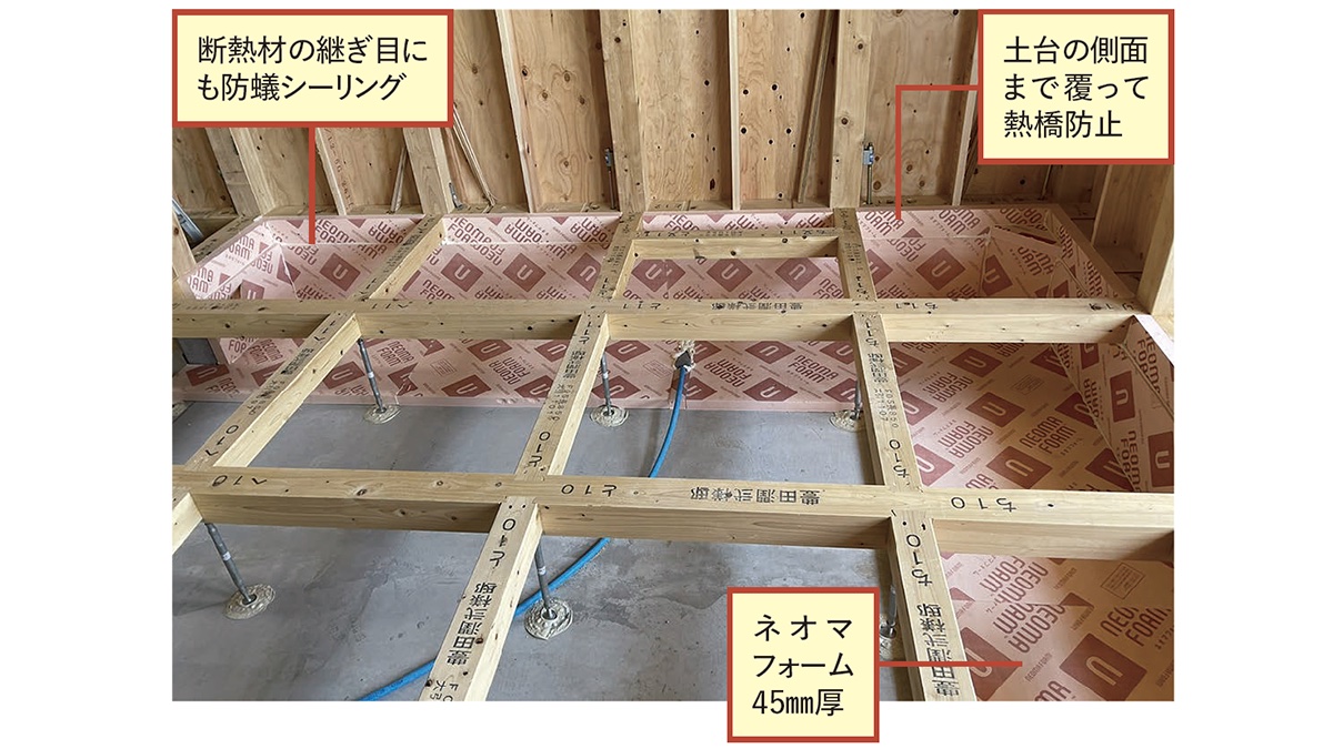 ◉建物下部は基礎外断熱+内断熱。基礎の外側に防蟻断熱材のスタイロフォームAT50mmを打ち込み、内側にネオマフォーム45mm厚を接着。基礎底盤はネオマフォーム45mm厚・幅900mm