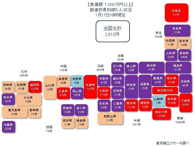 都道府県別(負債1000万円以上)では、東京都が570件と全体の2割強(21.8%)を占め、大阪府274件、福岡県・神奈川県各125件、愛知県123件、兵庫県118件、北海道91件と続く。10~20件未満が12県、20~30件未満が9県、30件以上は24都道府県に広がっている。