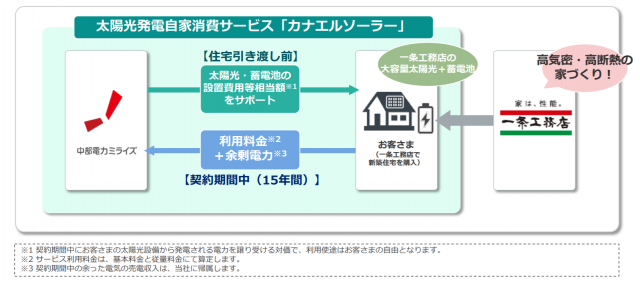 中部電力ミライズ(名古屋市)と一条工務店(東京都江東区)はこのほど、一条工務店の新築住宅を購入する顧客を対象に、家庭向け太陽光発電自家消費サービス「カナエルソーラー」の提供を開始した。