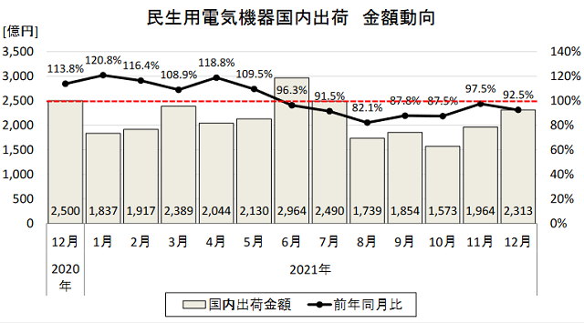 2021年は、全体で2兆5215億円、前年比99.4%と6年ぶりのマイナスとなった。6月以降、前年の需要増加の反動と夏の天候不順の影響により、前年同月比でマイナスが続いたが、過去10年平均(2兆3303億円)を大幅に上回り高い水準を維持していることがわかった。