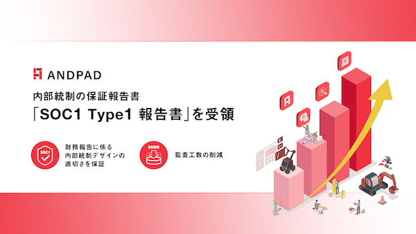 アンドパッド(東京都千代田区)は、同社が提供する現場管理クラウドサービス「ANDPAD」が、クラウドサービスの”信頼の証”と言われる「SOC1 Type1報告書」を受領したと公表した。