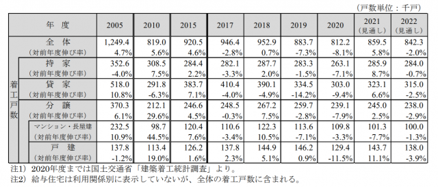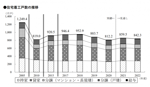 2022年度の民間住宅投資額は、前年度比2.1%減の15兆1800億円と予測した。