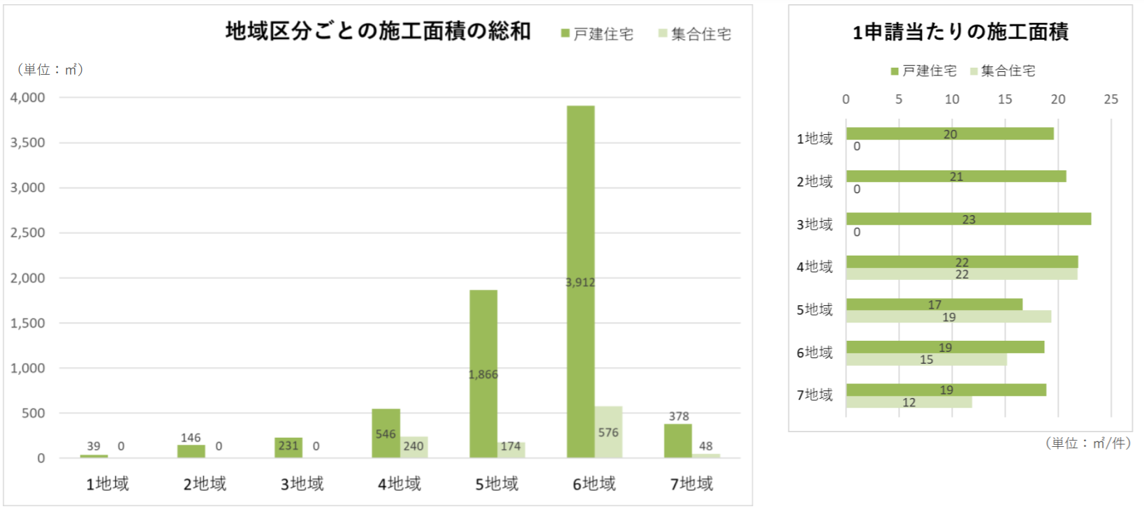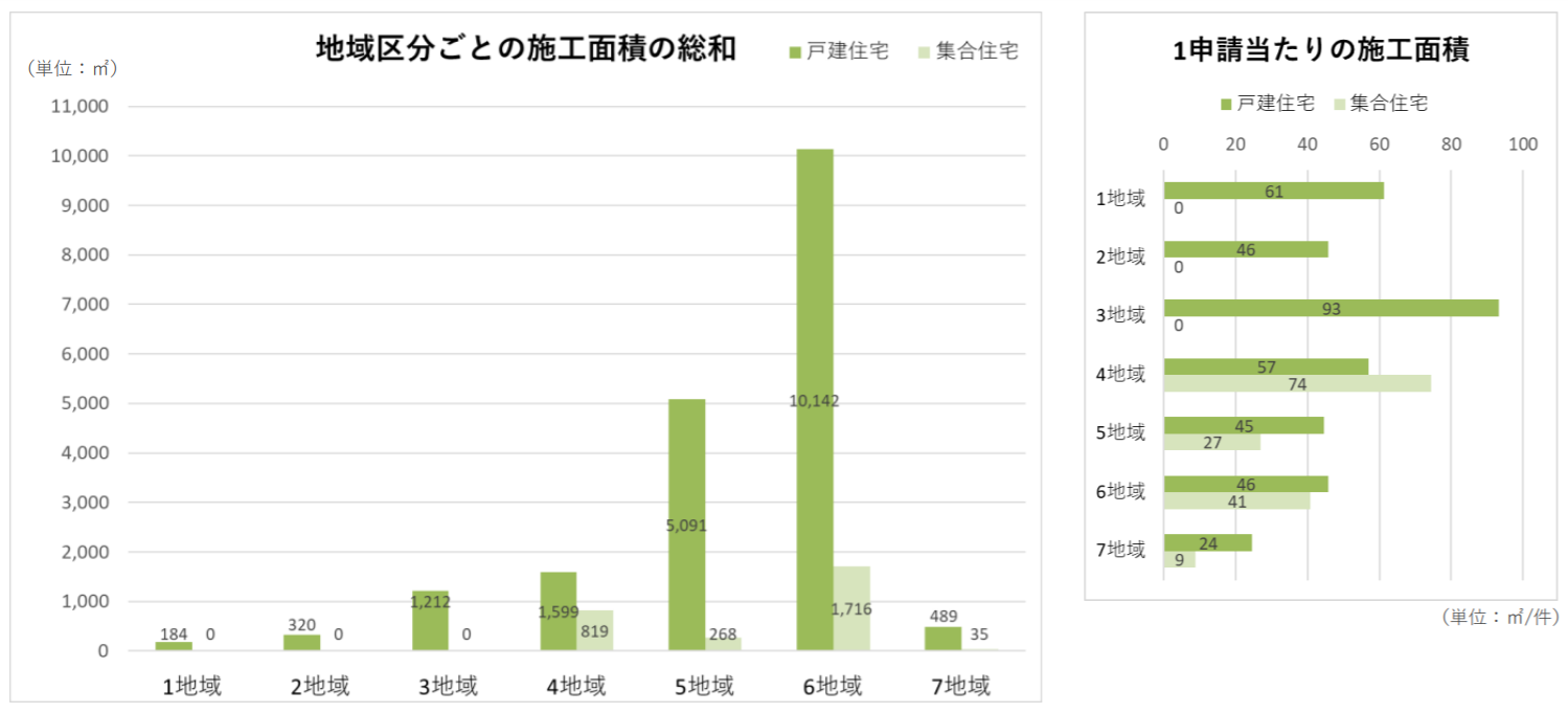 調湿建材は6地域43件1448m2、5地域22件1180m2。1申請当たりの施工面積は3地域が62m2、5地域が54m2、4地域が46m2、7地域が43m2だった。