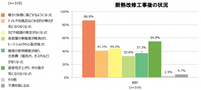 断熱改修で、光熱費が「安くなった」との回答が17.0%、「やや安くなった」が53.7%で、全体の70.7%を占めた。工事について「満足」60.7%、「やや満足」31.8%。「暖かく快適に過ごせるようになった」との回答は86.8%、「遮音性が上がり、外の音が気にならなくなった」が54.9%だった。不満を感じる点としては、「結露が発生する」「二重窓の開閉が大変」などが挙がった。
