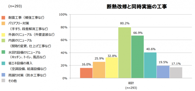 築年数別の分析では、断熱改修工事と同時に「耐震工事を実施した」割合は、築年数40年以上45年未満が最も多く38.2%。45年以上は29.5%、35年以上40年未満は14.6%だった。