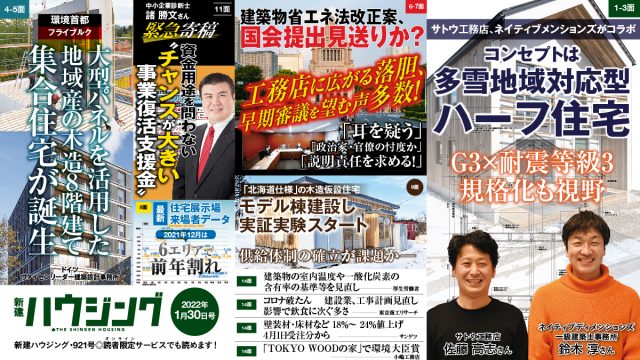 最新1月30日号のトップ記事は、サトウ工務店(新潟県三条市)とネイティブディメンションズ一級建築士事務所(新潟市)によるコラボ事例を取り上げます。HEAT20・G3を上回るUA値0.18W/m2K、耐震等級3(積雪1m)の性能を備え、ライフステージや家族構成などの変化に応じて間取りを自由に変えることができる住宅を、三条市内に完成させました。コンセプトは「多雪地域対応型ハーフ住宅」。