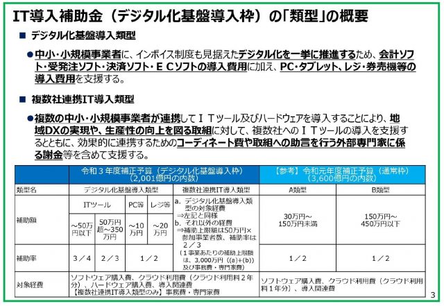 ところがこのITツールを導入するのに合わせて購入する場合、パソコンやタブレットは10万円まで、レジや券売機は20万円まで補助金が出る。この背景には、中小企業ではいまだITシステム導入の前提となるノートパソコンやタブレットなどの設備さえ導入されていないところが多く、生産性向上のネックとなっているためだ。この類型を使ってDX化を加速させよう。