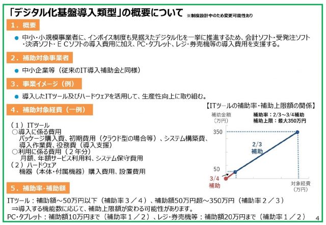 IT導入補助金で2022年から導入される類型として「デジタル化基盤導入類型」というものがある。これは「ITシステムを導入するならばパソコンやタブレットなどの購入代金も補助する」という制度だ。国の補助金の対象となるのは本来、事業に必要な専用の設備に限られており、パソコンやタブレットなど、他に容易に転用できる設備は対象とならない。他の補助金制度ではこのほか、スマートフォン、プリンター、家具、自動車などが対象外の設備として列挙されている。