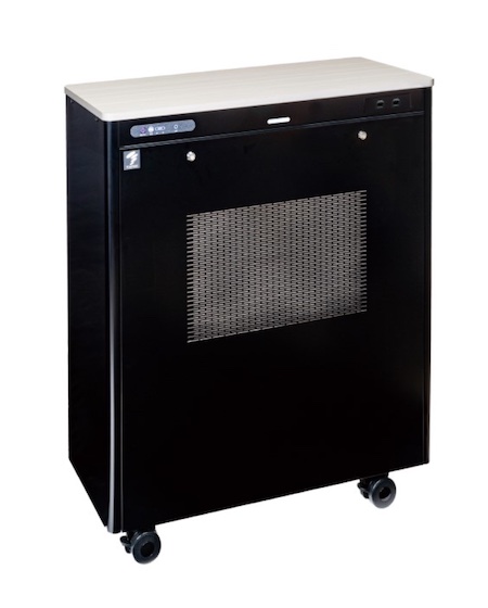 人が近づいた際に作動する人体検知センサを搭載。外形寸法はW890×D410×H1050mmで、キャスター、2口のUSB充電ポート付き。