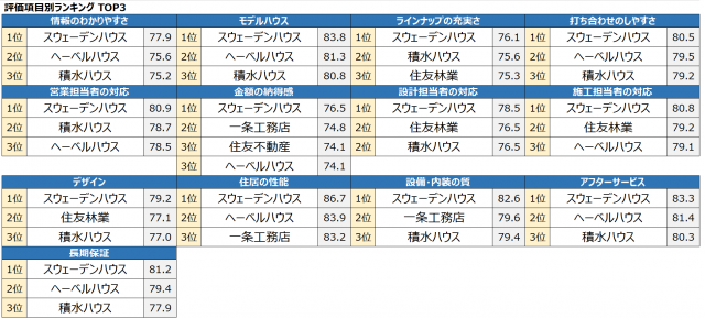 総合1位は、調査開始以来、8年連続で「スウェーデンハウス」(東京都世田谷区)が獲得した。全13評価項目で1位となり、建築構造や基本性能、住居の耐火性や断熱性、気密性などを評価した「住居の性能」では86.7点と特に高い評価を得た。そのほかの部門では、地域別「関東」、男女別「男性」「女性」、年代別「40代」、世帯別「1世帯」、工法別「木造」、築年数別「2~6年以内」「7~10年以内」でそれぞれ1位となった。