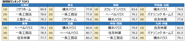 総合3位は「積水ハウス」(大阪市)で、地域別「東北」で6年連続、「甲信越・北陸」で7年連続、「近畿」「中国・四国」で2年連続1位となった。そのほか、総合9位の「ミサワホーム」(東京都新宿区)は、「北海道」部門で2年連続1位を獲得している。