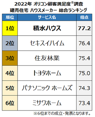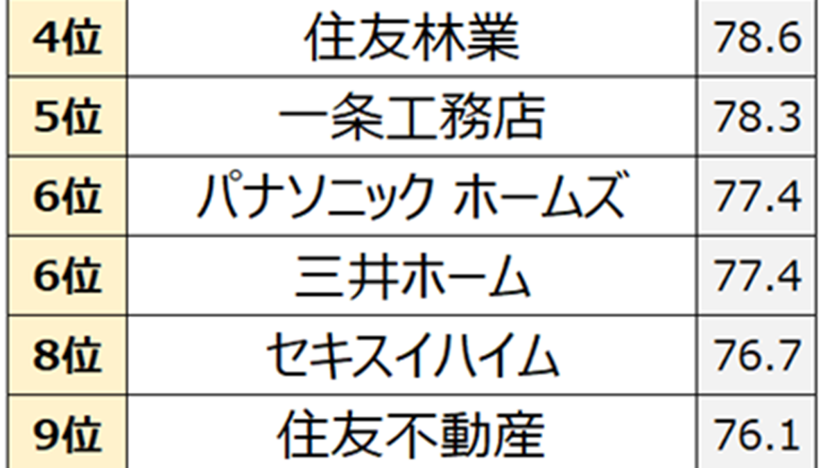 総合2位はセキスイハイム(積水化学工業、大阪市)で、評価項目「立地」「住宅構造・設計」「長期保証」「アフターフォロー」の4項目のほか、築年数別「2~6年以内」で1位を獲得。総合3位は住友林業(東京都千代田区)で、前回の総合5位からランクアップとなった。