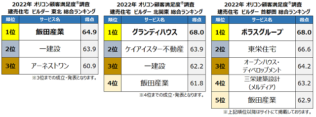 「北関東」では、グランディハウス(栃木県宇都宮市)が3年連続総合1位となった。全評価項目で1位となったほか、地域別「茨城県」「栃木県」、男女別「男性」「女性」、築年数別「7~10年以内」で1位を獲得した。また、総合得点が60点以上など高評企業の「横尾材木店」(埼玉県本庄市)は、「群馬県」部門と「2~6年以内」部門で初の1位となった。