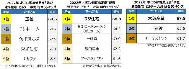 「東海」は、玉善(名古屋市)が2年連続で総合1位となった。全評価項目で1位だったほか、男女別「男性」、築年数別「7~10年以内」で1位だった。また総合7位の一建設(東京都豊島区)は「岐阜県」部門、高評企業のサーラ住宅(愛知県豊橋市)は「愛知県」部門でそれぞれ初の1位を獲得した。